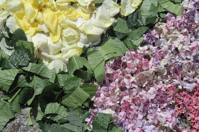 O tapete de flores que nós fazemos é constituído por módulos, digamos assim, cada um sendo um rectângulo. Aqui mostro alguns dos meus favoritos, mas eram muitos mais, até porque costuma ser sempre preciso enfeitar em frente das casas onde as pessoas não enfeitam.