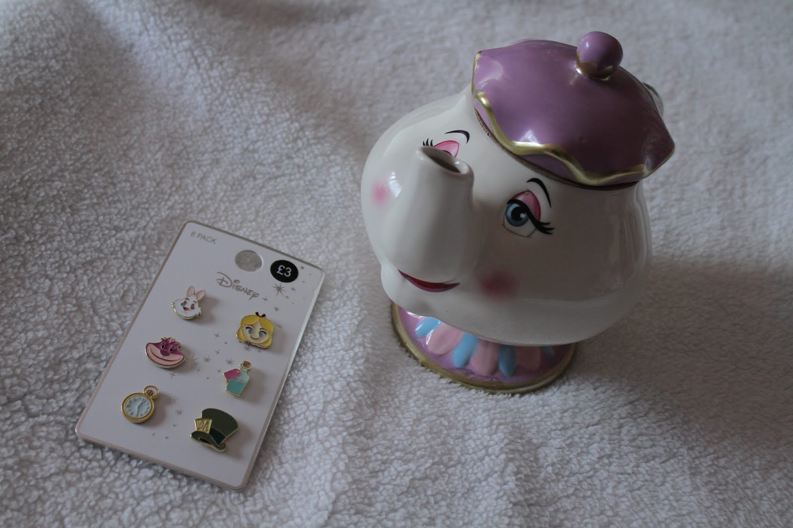 Uns amigos que agora moram por Londres foram à Primark comprar umas coisas que eu queria e acabaram a oferecê-las como prenda de aniversário. Finalmente tenho o bule da Mrs. Potts para se juntar às chávenas que tenho do Chip! Os pins da Alice são tão bonitos!