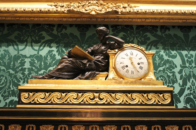 Ai os relógios. Um por cada lareira que existe, sem dúvida uma das coisas que mais me fascinou. Admito que nem sou a maior apreciadora de relógios, não uso nenhum no pulso, não tenho no quarto. Mas estes encantaram-me, porque, para além de serem muito bonitos e extremamente trabalhados, estavam todos a funcionar, o que é raro. Isso, para mim, só mostra a dedicação que há no Museu para que tudo seja mostrado nas melhores condições, e os relógios fazerem tick tack dá logo outro ambiente, porque é uma presença marcada em cada sala.